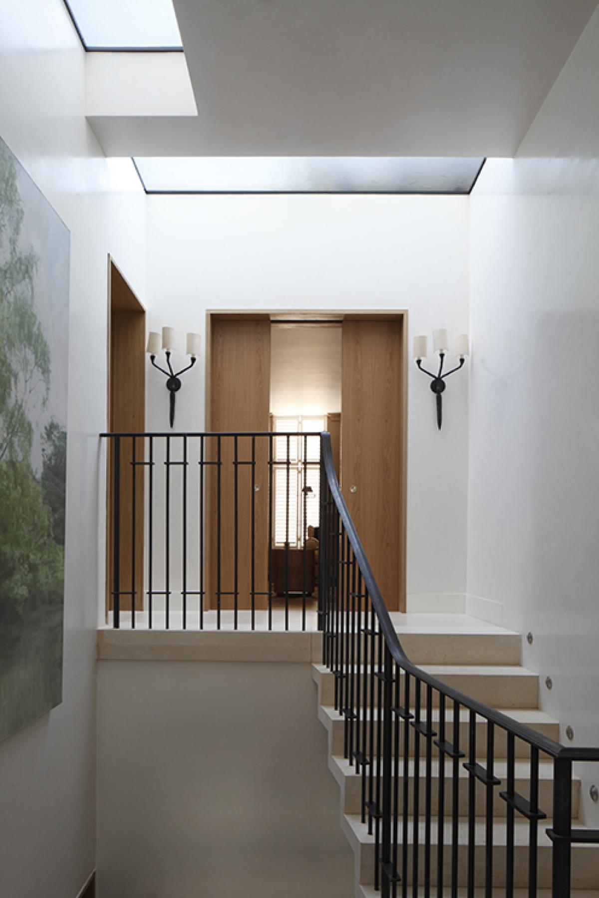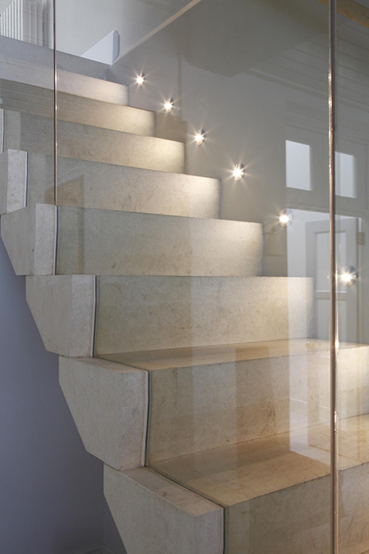 Major alterations and refurbishment of a large listed townhouse in Belgravia. The existing property consists of the main house as well as two conected mews houses at the rear. An un-lovely central lightwell did little to benefit the house and added to the awkward and convoluted circulation. We obtained planning approval to enlarge and enclose the lightwell to create a spacious and light-filled internal atrium which includes a spectacular floating stone stair, unlocking movement through the house and creating a brand new space at its heart. The entire house underwent a complete internal and external refurbishment and was completed in 2013. This project was carried out under my directorship at Cross Harris Umney Architects. Stone staircases fabricated by The Stonemasonry Company.